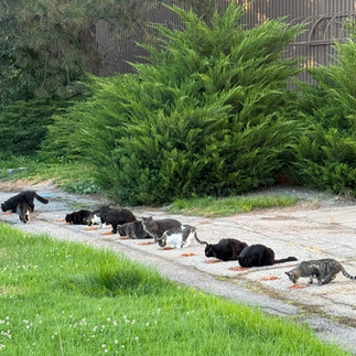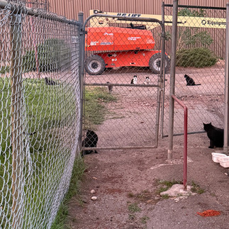 The decision was to fence in a small area where Terry and Tracy could feed and trap. This meant that the colonies that we're not used to being fed together would have to come to the same small location to eat. Most of the cats lived inside the stadium behind the small enclosure where they were to be fed. After looking at the new arrangement it seemed this might be a better way for trapping if the cats found their way to food because the traps would be set in a small area instead of all over the fairgrounds. It wasn't long before we saw cats from all the colonies gathering at the small enclosure waiting for their nightly feeding.